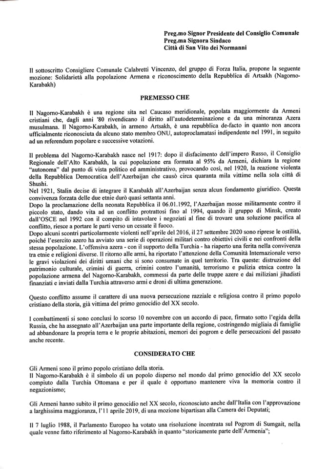 «Շնորհայալություն ենք հայտնում Իտալիայի Սան Վիտո դեյ Նորմաննի քաղաքի համայնքային խորհրդի անդամներին խորհրդի անդամ Վինչենցո Կալաբրետտի ներկայացրած Արցախի ճանաչման վերաբերյալ բանաձևը միաձայն ընդունելու համար։ Բանաձևում hամայնքային խորհուրդը համերաշխություն է հայտնում Արցախի հանրապետության ժողովրդին, դատապարտում է ադրբեջանական ագրեսիան և հորդորում է Իտալիայի իշխանություններին ճանաչել Արցախի Հանրապետությունը»: