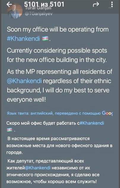 Այսպես կոչված՝ «Լեռնային Ղարաբաղի ադրբեջանական համայնք» ՀԿ նախագահ Թուրալ Գանջալիևը հայտարարել է, որ շուտով իր գրասենյակը գործելու է Ստեփանակերտում, հիմա, արդեն, օֆիսի համար հարմար տարածք է փնտրում։