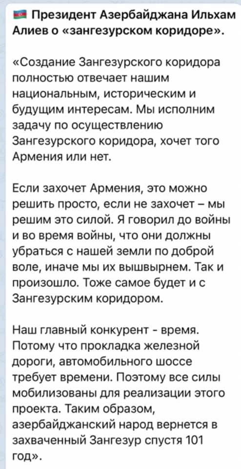 ՈՐՊԵՍԶԻ Ալիեւը սպառնա հերթական պատերազմով ու Զանգեզուրի պահանջով /հղումը՝ ստորեւ/, իշխող ուժի գլխավոր ստահակն էլ առանց կռվի հանձնի հայրենիքի հերթական մասը։