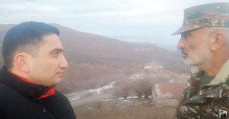 «Այս նկարում Սյունիքի Շուռնուխ գյուղի ղեկավար Հակոբ Արշակյանի հետ կանգնած ենք ադրբեջանական դիրքից մետրեր հեռու։ Հակոբն ու իր եղբայր Արարատը (Սյունիքում նրան ճանաչում են Աշխարհաբեկ անունով) մասնակցել են 2020-ի պատերազմին, իսկ նոյեմբերի 9-ից հետո երկու եղբոր տները հանձնվել են թշնամուն։