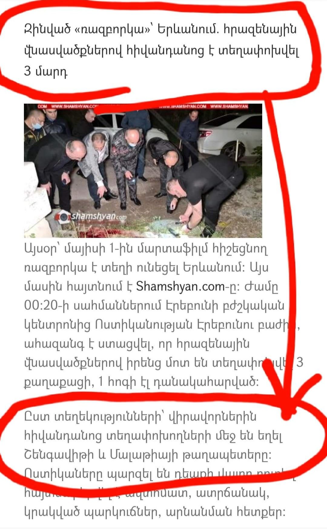 Ըստ լրատվամիջոցների, Երևանում զինված «ռազբորկա» է տեղի ունեցել, որտեղից հրազենային վնասվածքներ ստացածներին հիվանդանոց տեղափոխողների մեջ են եղել Երևանի Շենգավիթի և Մալաթիայի թաղապետերը...