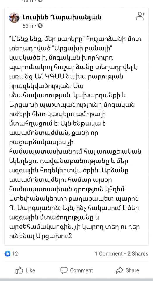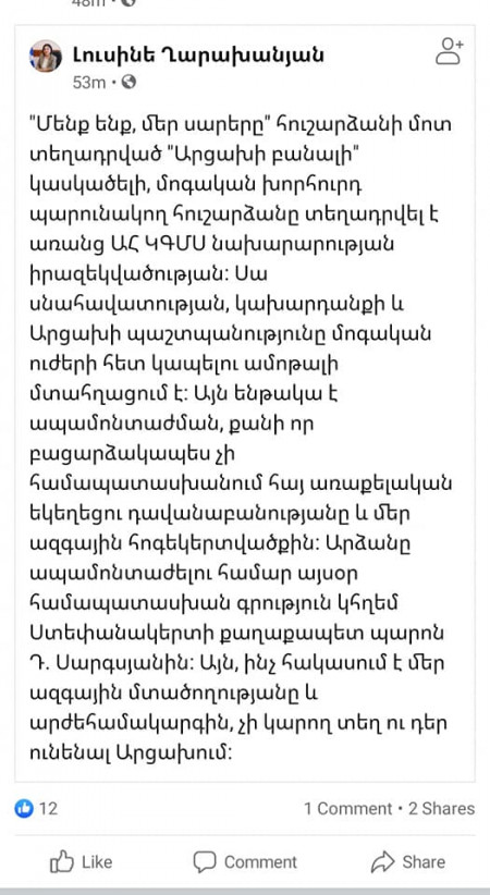 Այդ անհասկանալի ու մեղմ ասած տարօրինակ հուշարձանի մասին որոշել էի չանդրադառնալ, քանի որ իմ կարծիքով այդ հուշարձանի կարիքն ընդհանրապես չկա և այս պահի դրությամբ մեր երկրի առաջ ավելի լուրջ մարտահրավերներ են դրված՝ ի դեմս Փաշինյանի կողմից ստորագրվելիք այսպես ասած «սահմանազատման փաստաթղթի», որով ճանաչվում է Ադրբեջանի սահմանները ու փաստորեն ուղղակի կերպով ճանաչում Ադրբեջանի տարածքային ամբողջականությունը և անտեսվում արցախահայության իրավունքները։ Բայց ստեփանակերտյան չինովնիկների «մտահոգված» գրառումները պարզապես աչք են ծակում ու աղաղակում իրենց անփութության ու անգործություն վերաբերյալ։