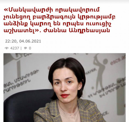 Վերջն իրոք որ եկել է։ Նույնիսկ մանկավաժից է շատ մեծ ջանքեր պահանջվում երեխային ճիշտ ուղու վրա դնելու համար, առանց այդ կրթության մարդն ի՞նչ է անելու երեխայի հետ։ Քանդելու է երեխայի աշխարհը, որովհետև մանկավարժությունը սեր ու նվիրում է, ոչ թե հաստիքով աշխատանք։