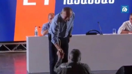 Նախկին նախագահը մոտեցավ բեմի եզրը, ընդունեց նվերը եւ սեղմեց նվիրողի ձեռքը: