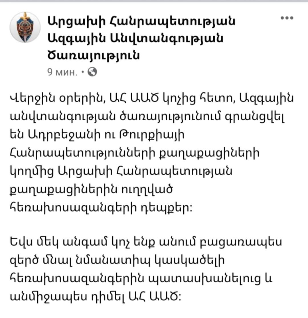 Արցախի ԱԱԾ-ն ճիշտ ա ասում` ուշադիր և զգոն եղեք, անպայման հետևեք իրենց կոչերին և զերծ մնացեք նմանատիպ կասկածելի հեռախոսազանգերին պատասխանելուց