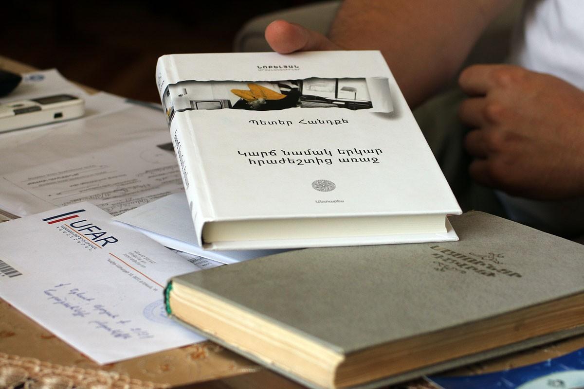 -Հա, ինքն է որոշել,- սա ասելուց հետո գրադարակից հանում է մի գիրք եւ դնում սեղանին. Պետեր Հանդքեի «Կարճ նամակ երկար հրաժեշտից առաջ» վեպն է:- Ես փոխել եմ, մի բան ավելացրել: Աբգարը բանակ գնալուց առաջ որոշեց էս գիրքը նվիրել ինձ, ու գիտեմ, որ վերնագրի համար է նվիրել: Ինքը, կարծես, գիտեր, որ սենց է լինելու: