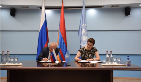 Այսօր Հայաստանում Ռուսաստանի Դաշնության դեսպան Սերգեյ Կոպիրկինը և Հայաստանում ՄԱԿ-ի Զարգացման ծրագրի (ՄԱԶԾ) մշտական ներկայացուցչի ժամանակավոր պաշտոնակատար Միհաելա Ստոյկոսկան ստորագրեցին փոխըմբռնման հուշագիր՝ Հայաստանի առավել խոցելի համայնքներին և խմբերին՝ ներառյալ տեղահանվածներին, աջակցություն տրամադրելու ծրագրի մեկնարկի վերաբերյալ: Ծրագիրը, մասնավորապես, կթիրախավորի Հայաստանի սահմանամերձ՝ Սյունիքի, Գեղարքունիքի և Վայոց Ձորի մարզերը: