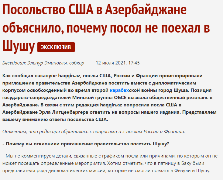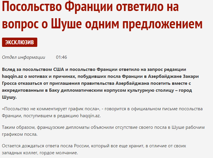 Այս կապակցությամբ Haqqin.az-ը հետաքրքրվել է Ադրբեջանում ԱՄՆ-ի և Ֆրանսիայի դեսպանություններից, թե ինչու՞ են նրանք չեն այցելել Շուշի (Ադրբեջանի կողմից ժամանակավորապես օկուպացված քաղաք Արցախում):
