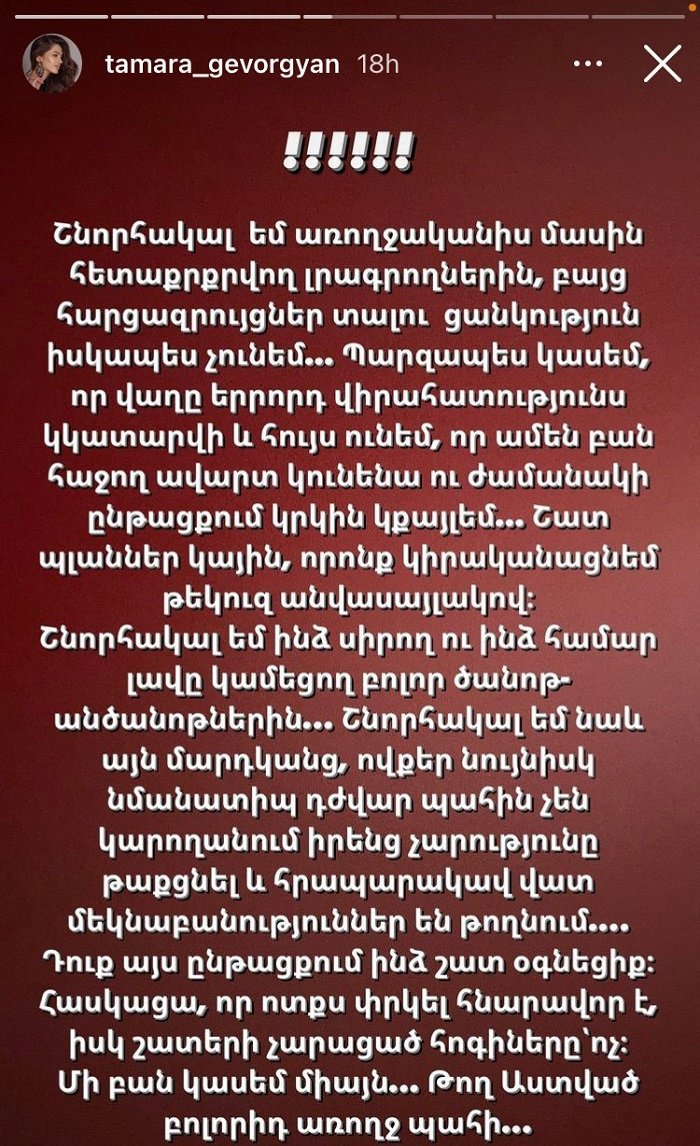 Շնորհակալ եմ ինձ սիրող ու ինձ համար լավը կամեցող բոլոր ծանոթ-անծանոթներին... Շնորհակալ եմ նաև այն մարդկանց, ովքեր նույնիսկ մարդու դժվար պահին չեն կարողանում իրենց չարությունը թաքցնել եւ հրապարակավ վատ մեկնաբանություններ են թողնում....