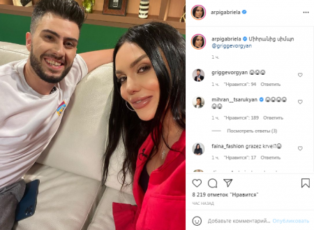 Դերասանուհի, երգչուհի Արփի Գաբրիելյանն Ինստագրամի իր էջում լուսանկար է հրապարակել հումորիստ Գրիգ Գևորգյանի հետ և նշել, որ վերջինս ավելի «սիմպո» է, քանի իր ամուսինը` Միհրան Ծառուկյանը: