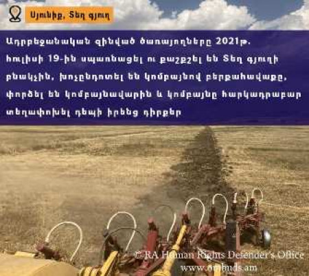 Փաստահավաք աշխանքները հաստատում են, որ ադրբեջանական զինված ուժերի ծառայողները փաստացի ապօրինաբար ազատությունից զրկել են իրեն սեփականության իրավունքով պատկանող հողատարածքում կոմբայնով հացահատիկի բերքահավաք իրականացնող ՀՀ Սյունիքի մարզի տեղ գյուղի բնակչին՝ կոմբայնավարին, տևական ժամանակով խոչընդոտել են գյուղատնտեսական աշխատանքների իրականացումը: