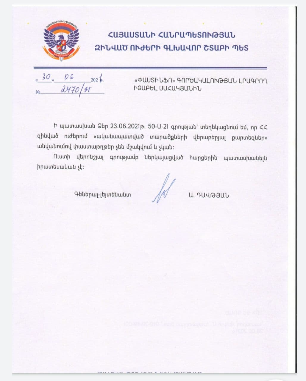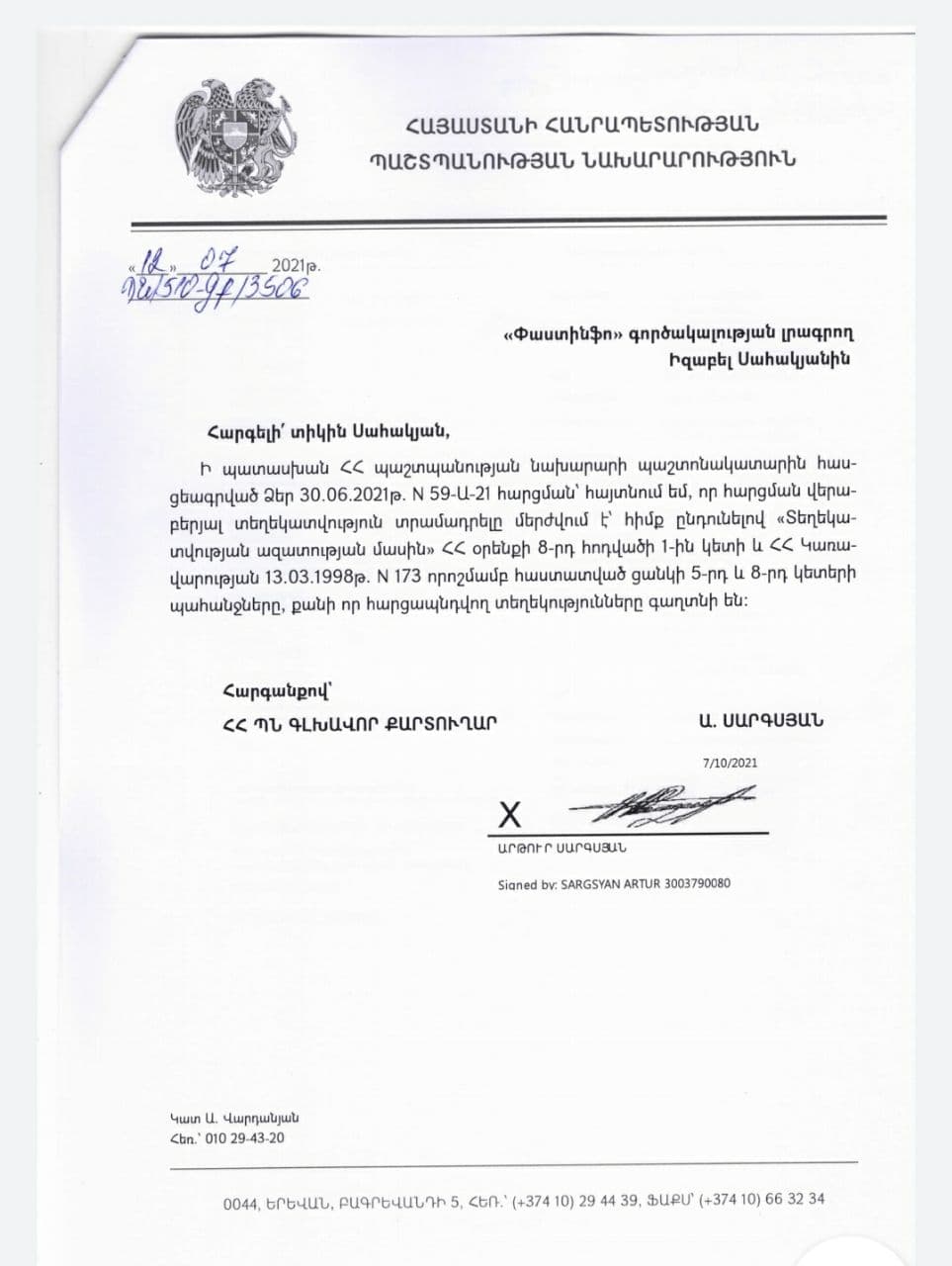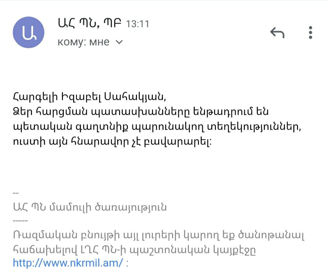 «Փաստինֆո»-ն նույն հարցի առնչությամբ գրավոր հարցում է ուղարկել ԱՀ ՊԲ, որտեղից նշել են, որ տեղեկատվության տրամադրել չեն կարող, քանի որ հայցվող տեղեկատվությունը պարունակում է պետական գաղտնիք համարվող տեղեկություններ։ Նույնաբովանդակ պատասխան է ստացվել ՀՀ ՊՆ-ից։ «Ի պատասխան ՀՀ պաշտպանության նախարարի պաշտոնակատարին հասցեագրված Ձեր 30․06․2021թ N 59-Ա-21 հարցման՝ հայտնում եմ, որ հարցման վերաբերյալ տեղեկատվություն տրամադրելը մերժվում է՝ հիմք ընդունելով «Տեղեկատվության ազատության մասին» ՀՀ օրենքի 8-րդ հոդվածի 1-ին կետի և ՀՀ կառավարության 13,03,1998թ N173 որոշմամբ հաստատված ցանկի 5-րդ և 8-րդ կետերի պահանջները, քանի որ հարցապնդվող տեղեկությունները գաղտնի են»,- նշված է ՀՀ ՊՆ-ի կողմից տրամադրված պատասխանում։ Այլ խոսքով՝ ՀՀ իշխանությունները առանց գաղտնազերծելու պետական գաղտնիք համարվող տեղեկատվությունը փոխանցել են թշնամի երկրին, եւ սա այն դեպքում, երբ ոչ միայն տրամադրված փաստաթղթերը, այլ անգամ դրանց գաղտնազերծված-չգաղտնազերծված լինելու մասին տեղեկատվությունը հայ հասարակության համար համարվում է պետական գաղտնիք։