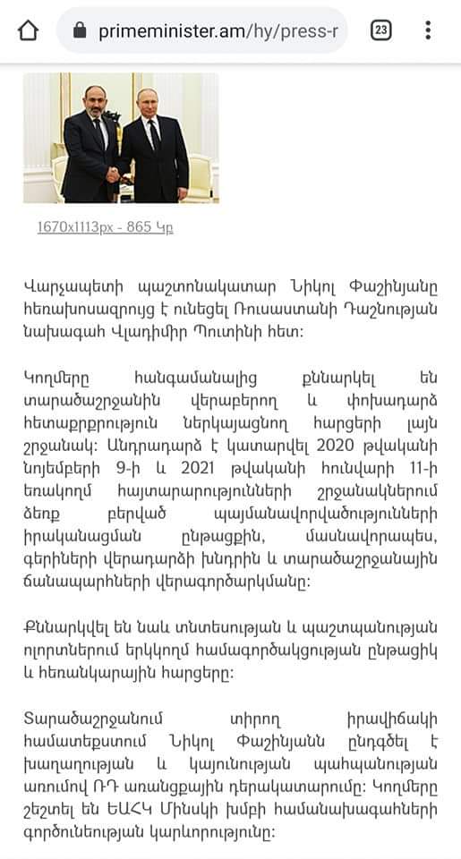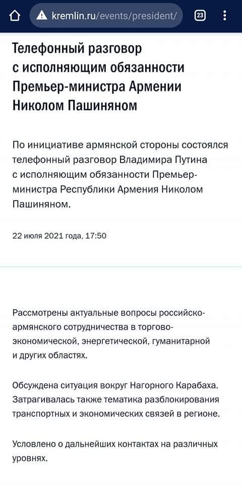 Ռուսաստանի Նախագահի պաշտոնական կայքում շեշտվում է, որ հեռախոսազրույցը տեղի է ունեցել հայկական կողմի նախաձեռնությամբ
