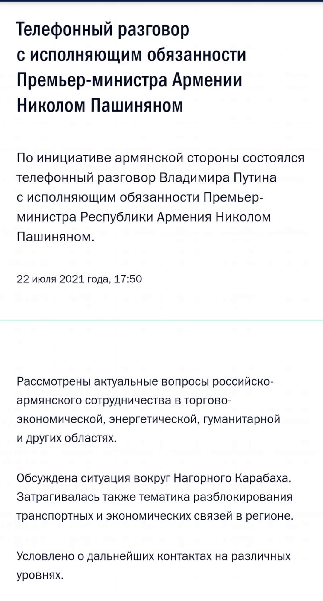 Նիկոլ Փաշինյան-Վլադիմիր Պուտին հեռախոսազրույցի վերաբերյալ պաշտոնական հաղորդագրությունում ոչինչ չկա Հայաստանի սահմաններին ստեղծված իրավիճակի մասին։