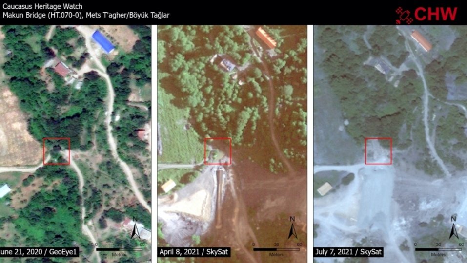 Խոսքը Հադրութի Մեծ Թաղեր գյուղի Մակուն կամուրջի մասին է, որն ավերվել է ադրբեջանի վերահսկողության տակ անցնելուց հետո գետի հատվածում արվող ճանապարհային շինարարության ժամանակ: Կազմակերպությունը արբանյակային լուսանկար է հրապարակել՝ ցույց տալով, որ կամուրջն ավերվել է ապրիլի 8-ից հուլիսի 7-ն ընկած ժամանակահատվածում: