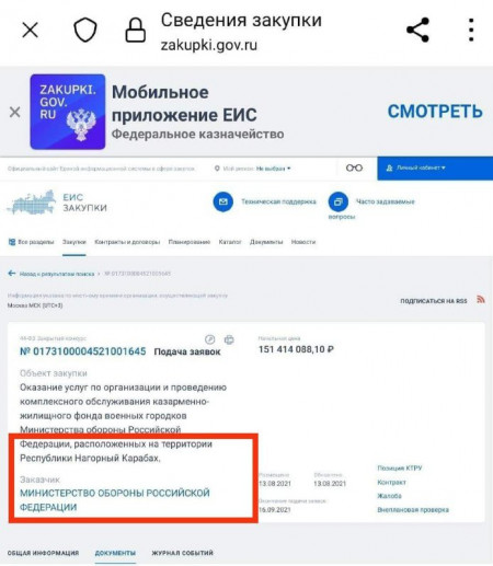 «Լեռնային Ղարաբաղի Հանրապետության տարածքում տեղակայված ՌԴ ՊՆ ռազմական բնակելի զորանոցների բնակարանային ֆոնդի կազմակերպման և պահպանման ծառայությունների մատուցումը»», - գրել է նա: