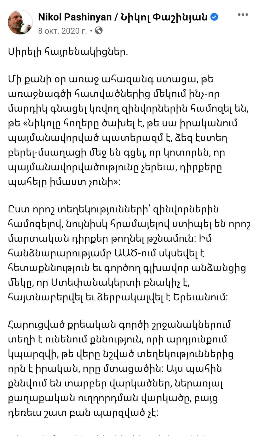 2020 թվականի հոկտեմբերի 8 ին` կռվի ամենաթեժ օրերին, վարչապետը հայտարարել էր, որ "ԸՍՏ ՈՐՈՇ ՏԵՂԵԿՈՒԹՅՈՒՆՆԵՐԻ ", (շատ նման է, ըստ օդում կախված լուրերի ), զինվորներին հրամայվել է , որպեսզի մարտական դիրքերը թողնեն թշնամուն, եւ գլխավոր անձանցից մեկը` ով Ստեփանակերտի բնակիչ է, հայտնաբերվել եւ ձերբակալվել է երեւանում։