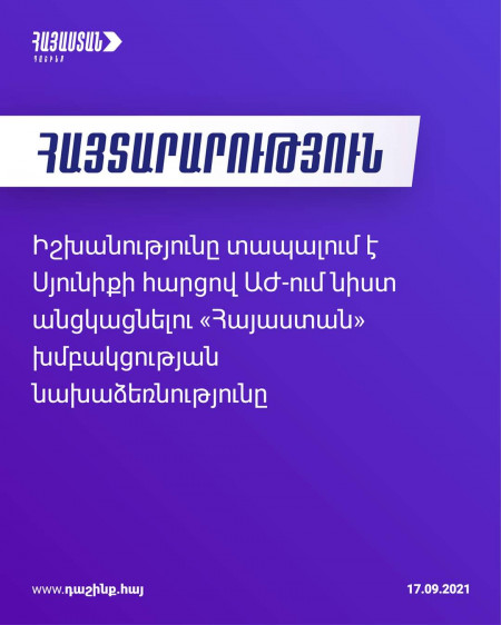 Իշխանությունը տապալում է Սյունիքի հարցով «Հայաստան» խմբակցության նախաձեռնությունը․ հայտարարություն