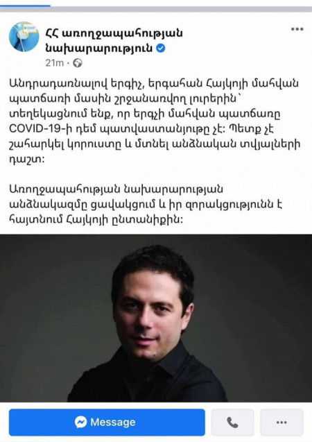 Երգչի մահվան պատճառը չի կարող լինել պատվաստանյութը, քանի որ երգիչը պատվաստված չի եղել․․․