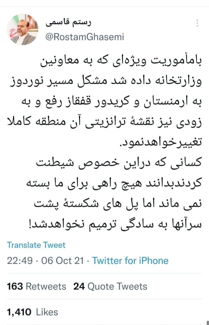 Դատելով Իրանի ճանապարհների և քաղաքաշինության նախարար Ռոստամ Ղասեմիի վերջին թվիթերյան գրառումից, լուծումներ են գտնվել Հայաստանի տարածքով, ադրբեջանական բաշիբոզուկներին շրջանցելով, իրանական բեռների փոխադրումն իրականացնելու համար և առաջիկայում ամբողջովին փոխվելու են տարածաշրջանային տրանզիտային քարտեզները։