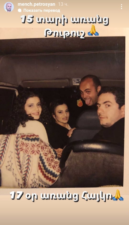 Իր միկրոբլոգի Stories բաժնում տեղադրված կադրին կից Արմեն Պետրոսյանը գրել է․ «15 տարի առանց Թութուշ, 17 օր առանց Հայկո»։