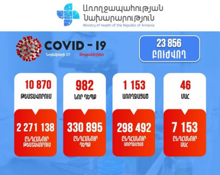 Ունենք կորոնավիրուսի 982 նոր դեպք, 46 մահ