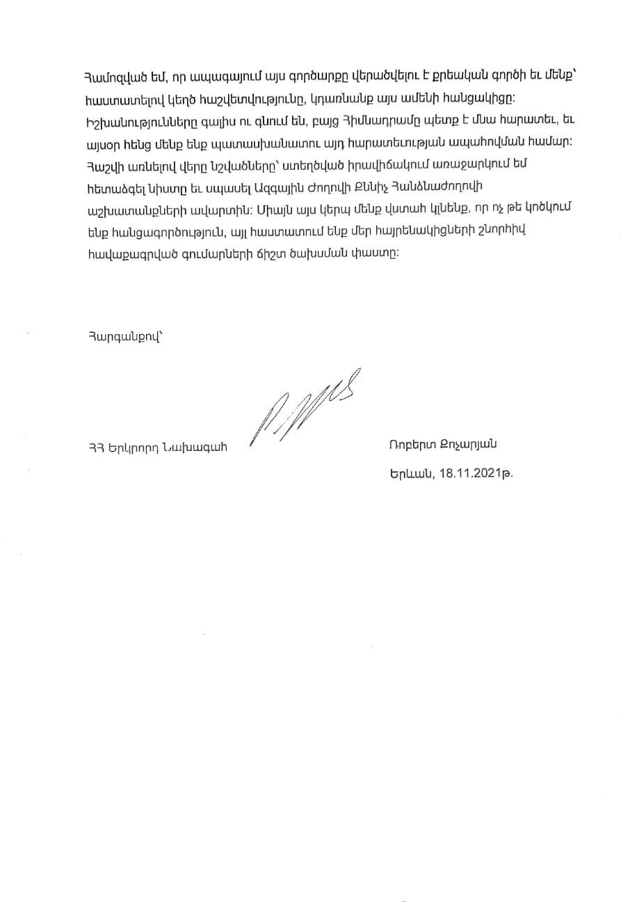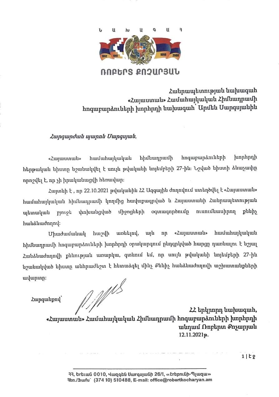 Հարգելի հայրենակիցներ, որոշում եմ կայացրել չմասնակցել ս.թ. նոյեմբերի 27-ին կայանալիք «Հայաստան» համահայկական հիմնադրամի հոգաբարձուների խորհրդի 30-րդ նիստին, որի օրակարգում ներարռված է հիմնադրամի կողմից ՀՀ կառավարությանը փոխանցված և աուդիտորական ընկերության կողմից չհաստատված ծախսերի ծախսագրման հաստատումը: Այս մասին հայտարարություն է տարածել ՀՀ երկրորդ նախագահ Ռոբերտ Քոչարյանը: