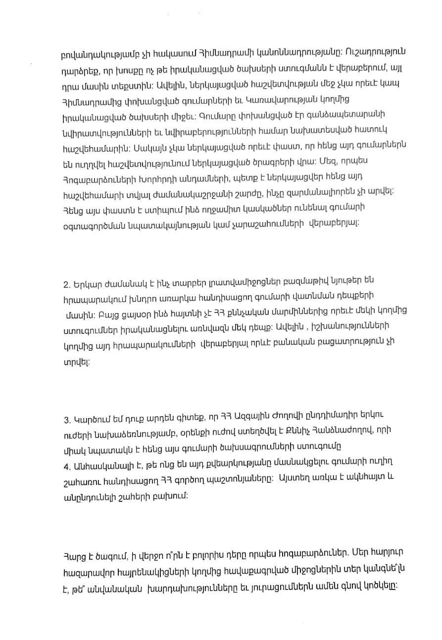 Նրա հայտարարությունում նաեւ ասվում է. «Հաշվի առնելով Ազգային Ժողովում այդ հարցով ստեղծված և այդ փոխանցված միջոցների օգտագործումն ուսումնասիրող քննիչ հանձնաժողովի ստեղծումը, գրություն եմ ուղարկել Հիմնադրամի հոգաբարձուների խորհրդի նախագահ, Հանրապետության նախագահ Արմեն Սարգսյանին՝ օրակարգի այդ հարցի քննարկումը հետաձգելու առաջարկով, որին արձագանք այդպես էլ չի եղել: Գրություն եմ ուղարկել նաև Հիմնադրամի հոգաբարձուների խորհրդի՝ կառավարության և պետական այլ մարմինների ներկայացուցիչներ չհանդիսացող անդամներին՝ նույն առաջարկով: Համահայկական հիմնադրամի նման ձևով աուդիտի հաստատումն անդառնալի վնաս կհասցնի այս խոշորագույն համահայկական կառույցի համբավին և հետագա գործունեությանը: Նման միջոցառման մասնակցելու և փաստացիորեն՝ դրան հանցակից դառնալուն արդարացում չկա: Իմաստ չեմ տեսնում մասնակցել մի նիստի, որը վնասելու է համահայկական կառույցին և մեր ազգային նպատակների իրագործմանը: