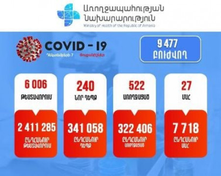Այս մասին հայտնեցին ՀՀ ԱՆ հիվանդությունների և վերահսկման և կանխարգելման ազգային կենտրոնից: Ընդհանուր թեստերի թիվը կազմում է 2411285 վերջին մեկ օրում` 6006 նոր թեստավորում: Փաստացի այս պահին բուժվում է 9477 պացիենտ. Մեկ օրում նվազել է 310-ով: Վերջին տվյալներով ապաքինվել է 322406 անձ` վերջին մեկ օրում 522 անձ: Մեկ օրում կորոնավիրուսի հետևանքով մահացել է 27 քաղաքացի, մահացածների թիվը 7718 է:
