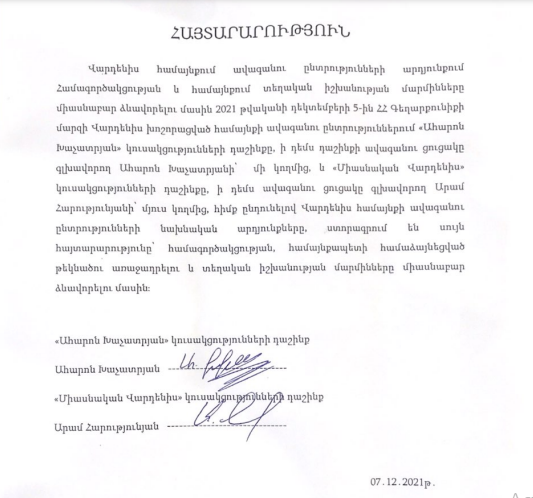 Վարդենիս համայնքում ավագանու ընտրությունների արդյունքում Համագործակցության և համայնքում տեղական իշխանության մարմինները միասնաբար ձևավորելու մասին 2021 թվականի դեկտեմբերի 5-ին ՀՀ Գեղարքունիքի մարզի Վարդենիս խոշորացված համայնքի ավագանու ընտրություններում «Ահարոն Խաչատրյան» կուսակցությունների դաշինքը՝ ի դեմս դաշինքի ավագանու ցուցակը գլխավորող Ահարոն Խաչատրյանի՝ մի կողմից և «Միասնական Վարդենիս» կուսակցությունների դաշինքը՝ ի դեմս ավագանու ցուցակը գլխավորող Արամ Հարությունյանի՝ մյուս կողմից, հիմք ընդունելով Վարդենիս համայնքի ավագանու ընտրությունների նախնական արդյունքները, ստորագրում են սույն հայտարարությունը համագործակցության, համայնքապետի համաձայնեցված թեկնածու առաջադրելու և տեղական իշխանության մարմինները միասնաբար ձևավորելու մասին: