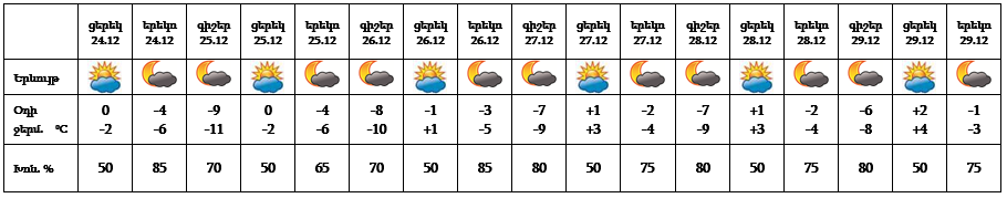 Դեկտեմբերի 24-ի ցերեկը, 25-29-ը սպասվում է առանց տեղումների եղանակ: