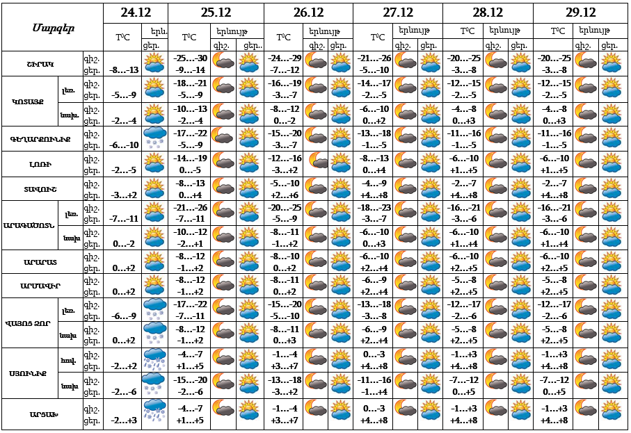 Դեկտեմբերի 24-ի ցերեկը առանձին շրջաններում սպասվում է ձյուն: Դեկտեմբերի 25-29-ը սպասվում է առանց տեղումների եղանակ: Լեռնային և նախալեռնային շրջաններում ճանապարհներին մերկասառույցը կպահպանվի: