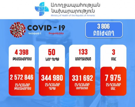 Հայաստանում արձանագրվել է կորոնավիրուսի 50 նոր դեպք, 3 մահ