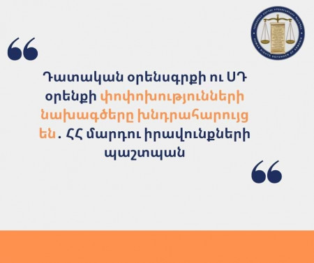ՀՀ մարդու իրավունքների պաշտպանը խնդրահարույց է համարում ՀՀ արդարադատության նախարարության նախաձեռնած ««Հայաստանի Հանրապետության դատական օրենսգիրք» սահմանադրական օրենքում փոփոխություններ կատարելու մասին» և «Սահմանադրական դատարանի մասին» սահմանադրական օրենքում փոփոխություններ կատարելու մասին» սահմանադրական օրենքների նախագծերի լուծումները։