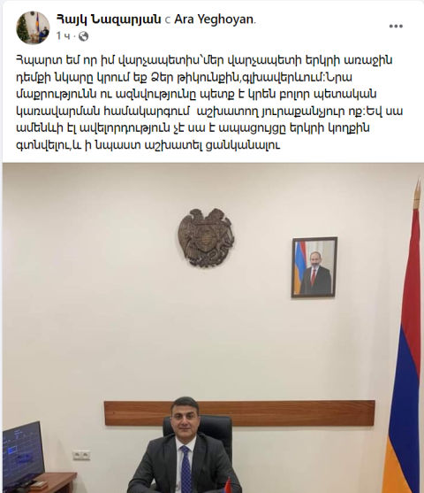 Պետական վերահսկողական ծառայությունում (ՊՎԾ) պետի տեղակալ վերանշանակված Արա Եղոյանի աշխատասենյակում՝ ուղիղ վերջինիս գլխավերևում, բնականաբար, կախված է Նիկոլ Փաշինյանի մեծադիր նկարը: Ինքը լուսանկարվել է այդ ֆոնին, նկարը տեղադրել սոցցանցի իր էջում. իր գործն է: