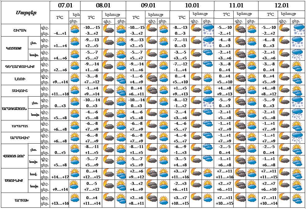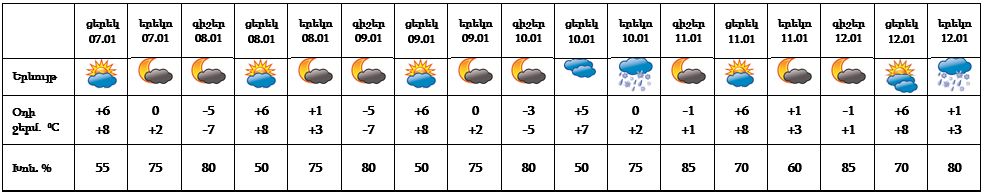 Հունվարի 7-ի ցերեկը, 8-9-ը, 10-ի գիշերը, 11-ին սպասվում է առանց տեղումների եղանակ: Հունվարի 10-ին և 12-ին կեսօրից հետո հնարավոր են թույլ տեղումներ: