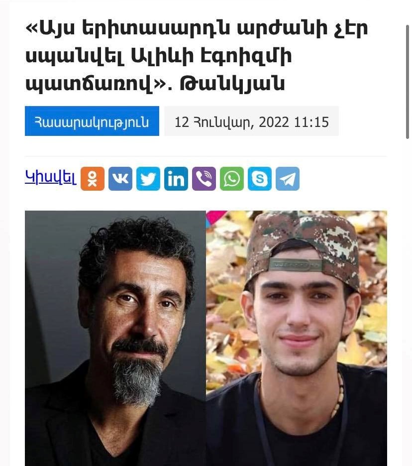Որ ալիևը թուրք ա՝ դա վաղուց գիտենք, բայց ալիևից ու թուրքից ավելի վատ դու ու քո պես անհայրենիքիներն են, սերժ թանկյան։ Էն «մտավորականներն» ու «արվեստագետները», ովքեր իրանց հեղինակությունն ու խոսքը օգտագործելով նպաստեցին էս երկրի հիմնասյուների քանդմանը։ Հենց նաև ձեր պես սրիկաների խղճին ա թե՛ երեկվա, թե՛ մեկ տարի առաջվա զոհված տղերքի արյունը։