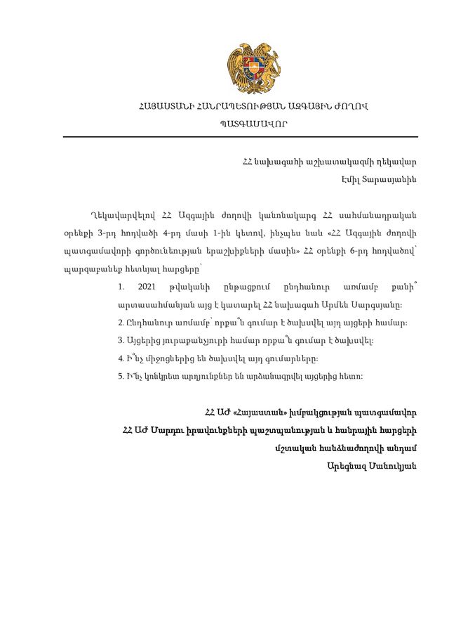 Դեռևս նախորդ տարեվերջին պատգամավորական հարցում էի ուղարկել ՀՀ նախագահի աշխատակազմի ղեկավար Էմիլ Տարասյանին՝ հետաքրքվելով, թե ՀՀ նախագահի պաշտոնը զբաղեցնող Արմեն Սարգսյանը