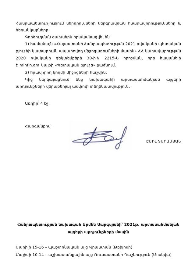 1) համաձայն «Հայաստանի Հանրապետության 2021 թվականի պետական բյուջեի կատարումն ապահովող միջոցառումների մասին» ՀՀ կառավարության 2020 թվականի դեկտեմբերի 30-ի N 2215-Ն որոշման, որը հասանելի է minfin.am կայքի «Պետական բյուջե» բաժնում.