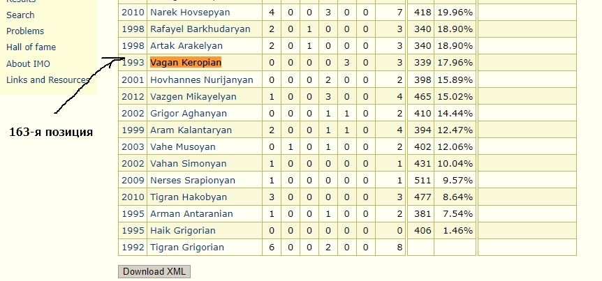 Լուծված խնդիրների քանակով՝ 171-րդ տեղ՝ 3 լուծված խնդիր (համեմատության համար առաջին տեղը զբաղեցրել է Վահե Փոլադյանը՝ 34 խնդիր)