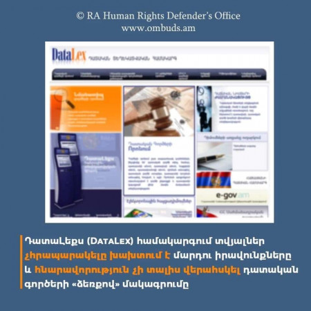 ԴատաԼեքս (DataLex) համակարգում տվյալներ չհրապարակելը խախտում է մարդկանց իրավունքները և հնարավորություն չի տալիս վերահսկել դատական գործերի «ձեռքով» մակագրումը. ՀՀ ՄԻՊ