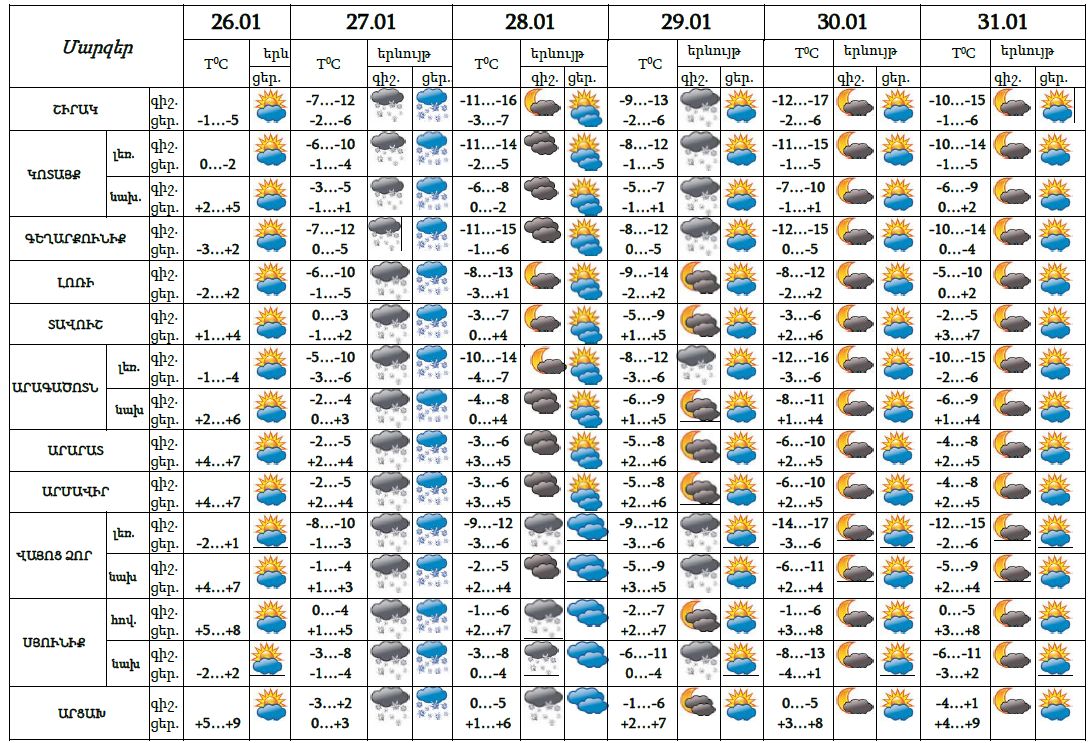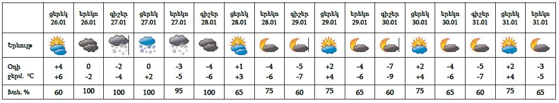 Հունվարի 26-ի ցերեկը, 28-31-ը սպասվում է առանց տեղումների եղանակ, 27-ին սպասվում է թույլ ձյուն: