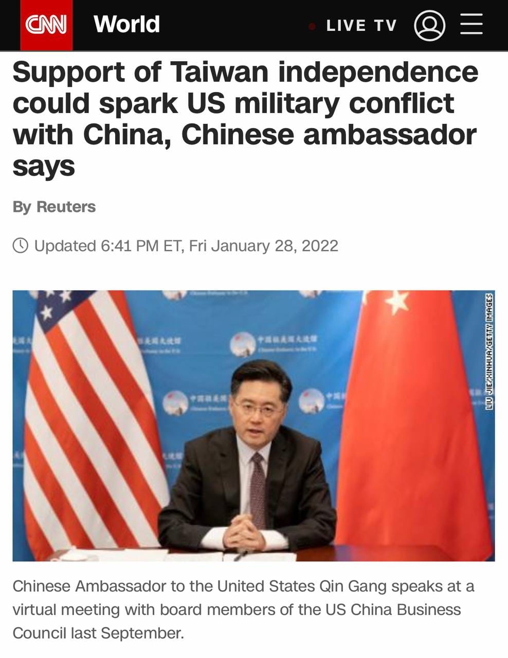 «Եթե Թայվանի իշխանությունները շարունակեն «քայլել անկախության ճանապարհով»՝ Վաշինգտոնի աջակցությամբ, ապա ԱՄՆ-ի և Չինաստանի միջև ռազմական հակամարտությունը հավանական է»,-ասել է դիվանագետը։ Գանգն ասել է, որ Չինաստանի և Թայվանի ժողովուրդները չինացի հայրենակիցներ են, և Պեկինը ջանքեր է գործադրում խաղաղ վերամիավորման համար։ «Սակայն Չինաստանը չի հրաժարվի վերամիավորման ոչ խաղաղ միջոցներից, քանի որ դրանք զսպող գործոն են», - զգուշացրել է դեսպանը: