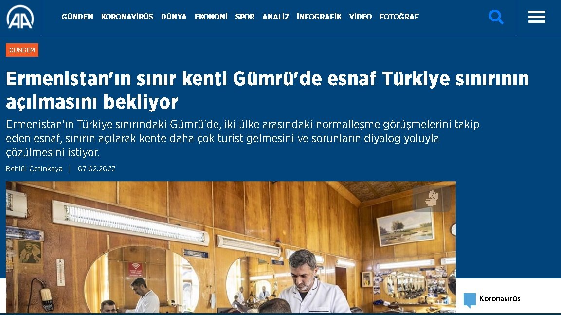 Հոդվածում ասվում է, որ Գյումրիում փոքր բիզնեսի սեփականատերերը ANADOLU գործակալության թղթակիցներին տված հարցազրույցներում կիսվել են Թուրքիայի հետ հարաբերությունների վերականգնումից իրենց ակնկալիքներով։
