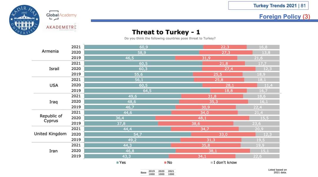 -Այսպես, այն հարցին, թե «թվարկված երկրները Թուրքիայի համար սպառնալիք ներկայացնում են», հարցվածների մեծամասնությունը՝ 60,9 %-ը Հայաստանը համարում է սպառնալիք։ Այս առումով Հայաստանը «առաջատար է» Թուրքիայի քաղաքացիների ընկալումներում։ Անհրաժեշտ է նշել նաև, որ այս ցուցանիշը շարունակաբար աճում է (2020թ. 58,9%-ը, իսկ 2019թ.՝ 46,5%-ն էր այդպես կարծում)։ Սպառնալիք ներկայացնող պետությունների ցանկում Հայաստանին հաջորդում են Իսրայելը, ԱՄՆ-ն, Իրաքը, Կիպրոսը, Իրանը, Ֆրանսիան, Սիրիան, Հունաստանը, ՌԴ-ն և այլն։