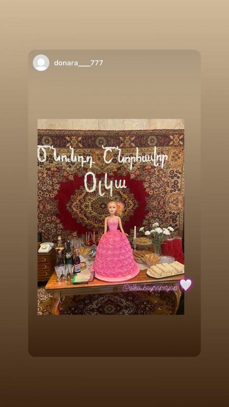 ԱԺ պատգամավոր Հայկ Սարգսյանի կինը՝ Օլյա Հայրապետյանը, իր ինստագրամյան էջի սթորի բաժնում կադրեր է հրապարակել, որտեղ երևում է, որ պատգամավորի կինը իր ծննդյան տարեդարձի խնջույքը նշում է 90-ականների ոճով։
