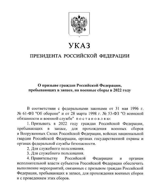 Հրամանագրի տեքստում նշվում է, որ Ռուսաստանի Դաշնության այն քաղաքացիները, ովքեր գտնվում են պահեստազորում, ենթակա են զորակոչի՝ զինվորական հավաքների անցկացման համար։