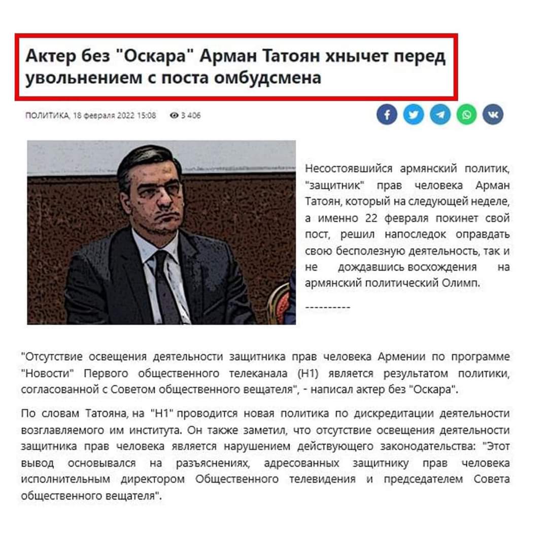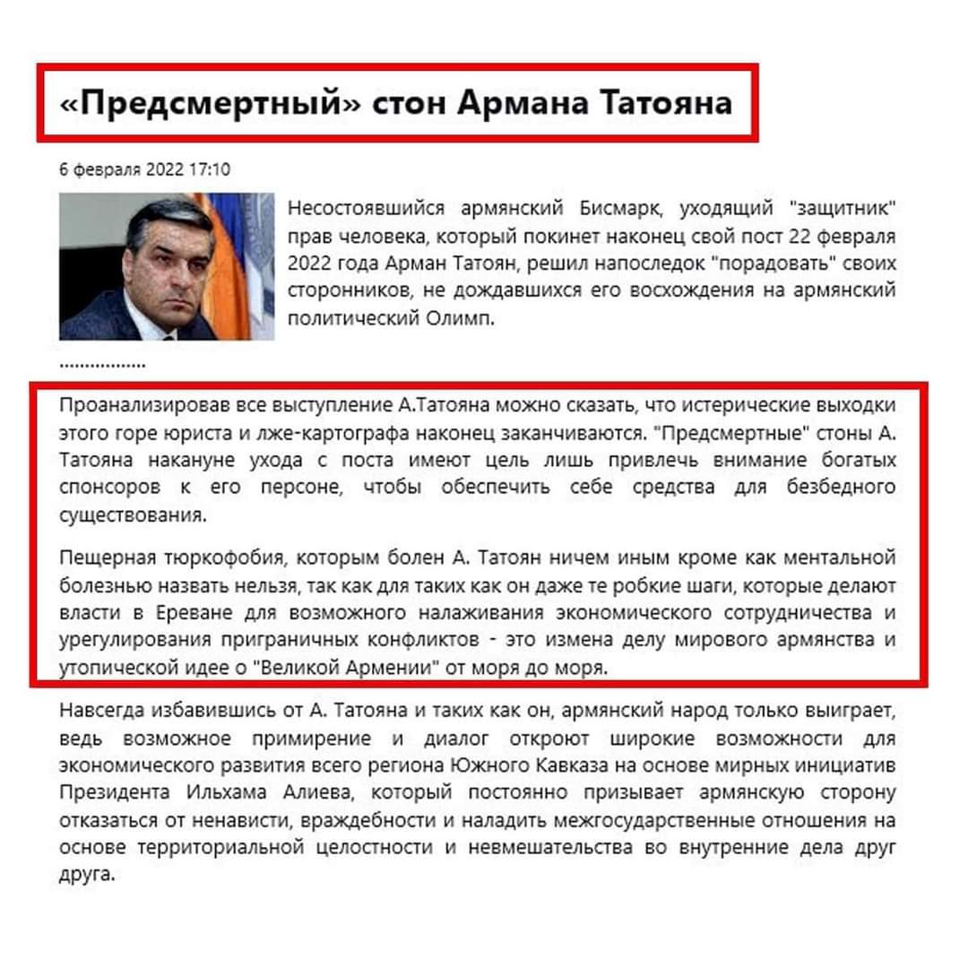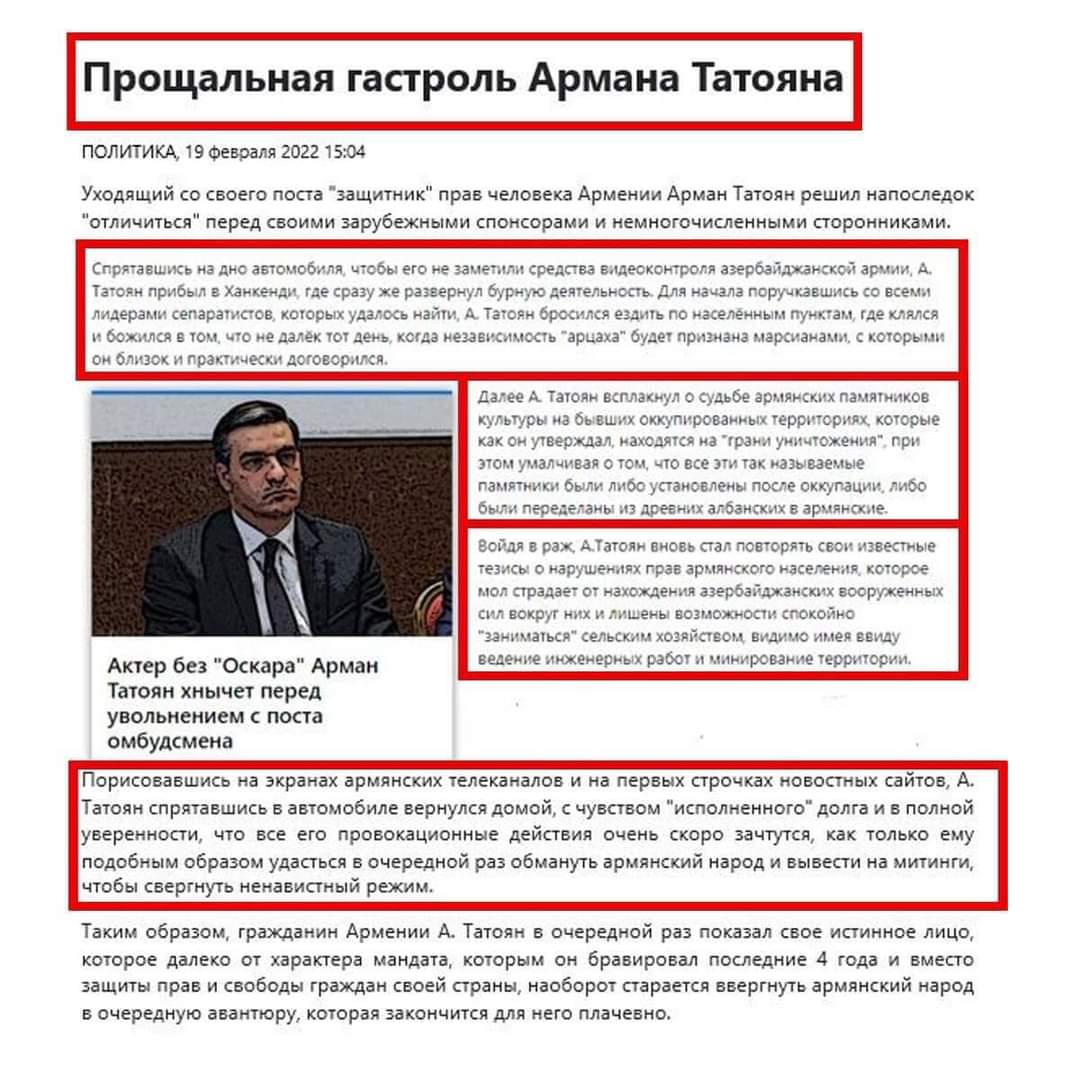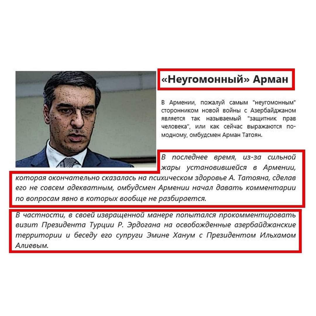 Ծայրահեղ ատելություն ու վիրավորանքներ ադրբեջանական լրատվամիջոցների կողմից ՀՀ մարդու իրավունքների պաշտպան Արման Թաթոյանի վերաբերյալ` կապված ՀՀ սահմանային բնակիչների իրավունքների պաշտպանության, Արցախ Պաշտպանի վերջին այցի հետ, իսկ պաշտոնավարման ավարտն ադրբեջանական ԶԼՄ-ներին պատճառել է մեծ ուրախություն: