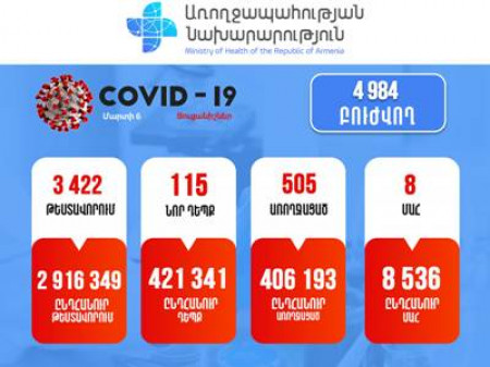 Հայաստանում մարտի 6-ի՝ ժամը 11:00-ի դրությամբ կորոնավիրուսով վարակվելու 115 նոր դեպք է գրանցվել, վարակվածների ընդհանուր թիվը հասել է 421 341-ի: Այս մասին NEWS.am-ը տեղեկանում է ՀՀ ԱՆ հիվանդությունների և վերահսկման և կանխարգելման ազգային կենտրոնից: