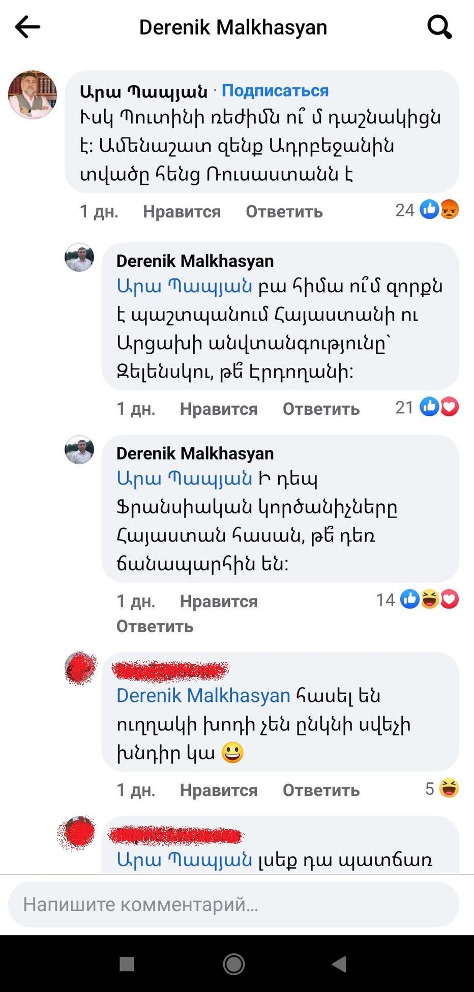 Մալխասյանի խոսքերը, ի թիվս այլոց մեկնաբանել է Կանադայի քաղաքացի, «ԱԺԲ» անդամ Արա Պապյանը և սկզբում հարց է տվել՝ «ո՞ւմ դաշնակիցն է Ռուսաստանը՝ Հայաստանի թե Ադրբեջանի», ինչին ստանալով պատասխան, որ Ռուսաստանը պաշտպանում է Արցախի և Հայաստանի անվտանգությունը, նշել է, որ իր կարծիքով Ռուսաստանը չի պաշտպանում ոչ Հայաստանի, ոչ էլ Արցախի անվտանգությունը: